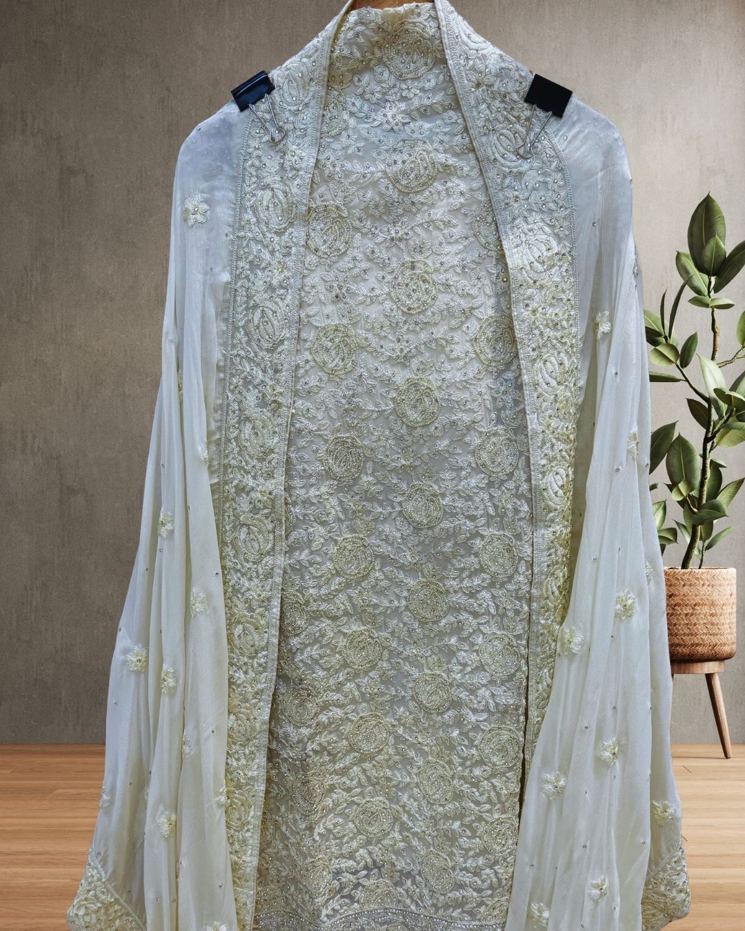 Cream georget unstitched kurta featuring heavy thread embroidery on the shirt for a refined festive look perfect for parties and grand occasions.