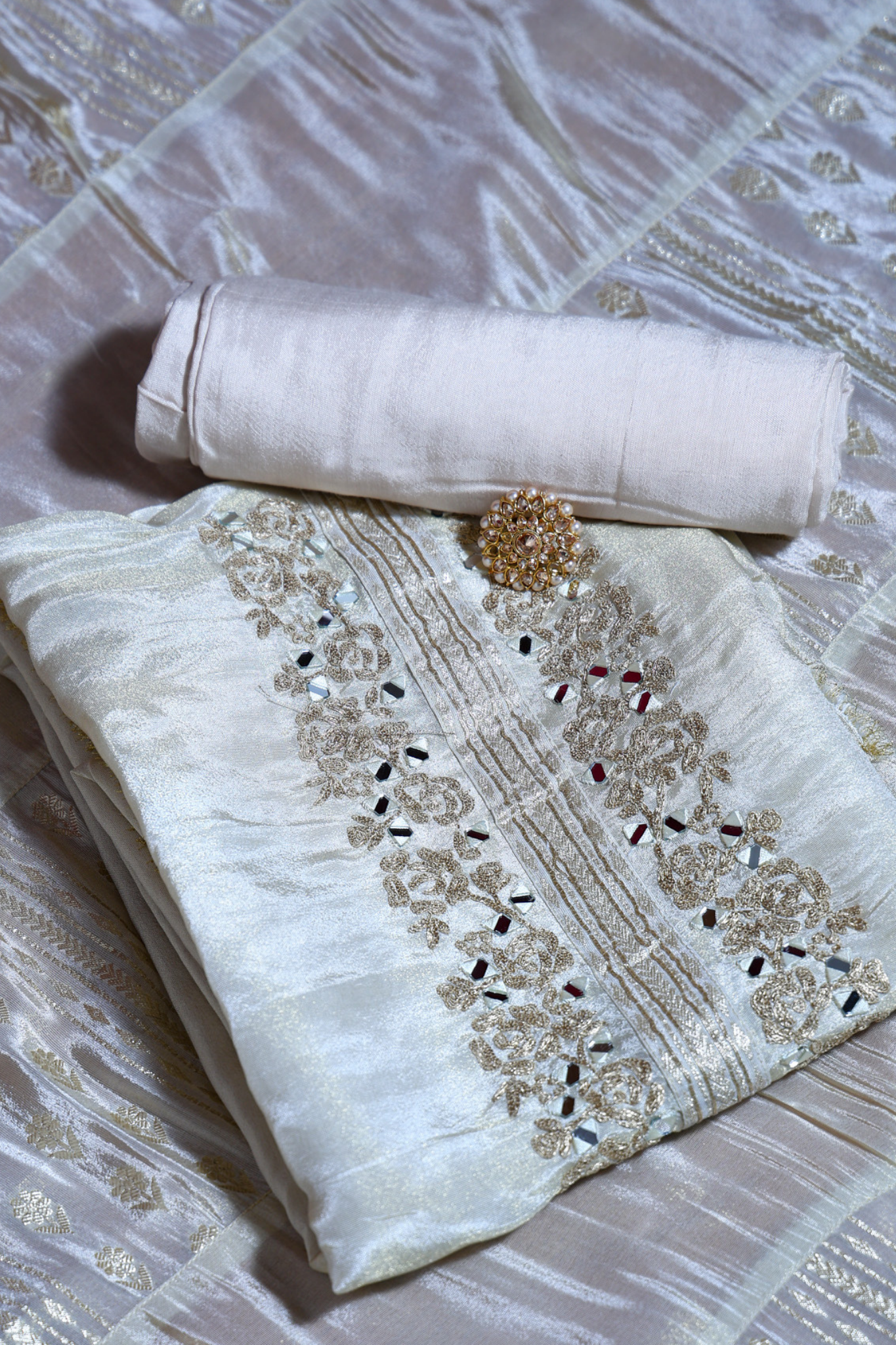 Golden shimmer tissue unstitched kurta with beautiful mirror and zari embroidery. The combination of golden shimmer tissue and mirror work creates a stunning glamorous look perfect for party and grand occasions.