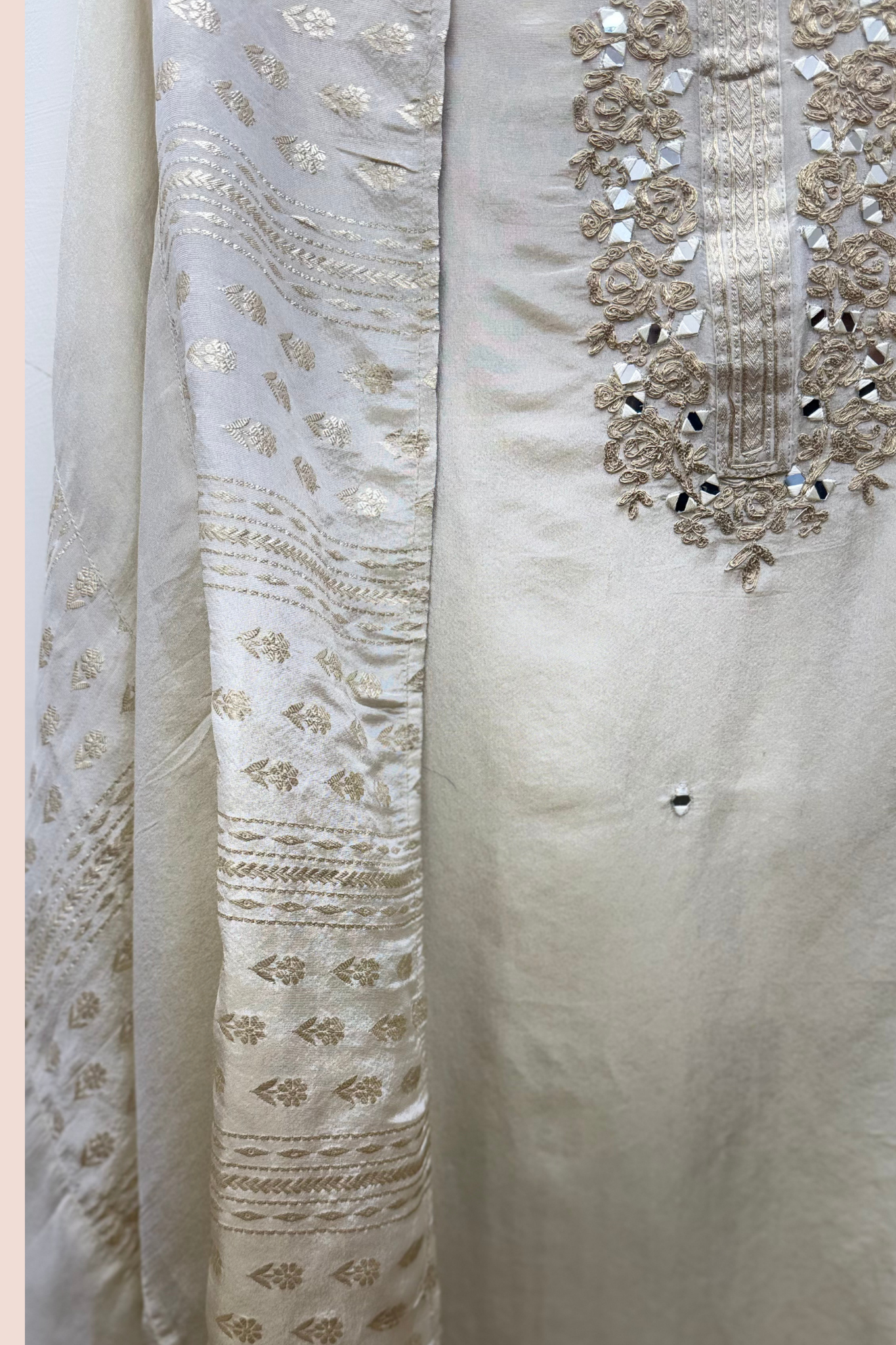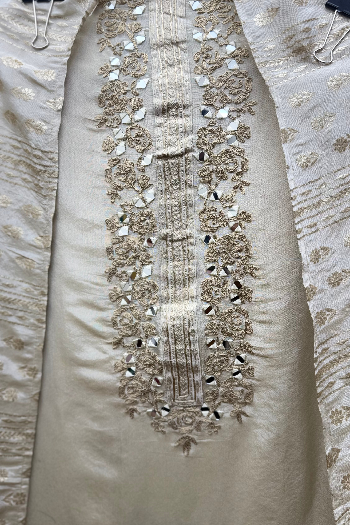 The shirt features detailed mirror and zari embroidery that adds a luxurious touch to the fabric. The work is done with precision and care, ensuring each detail stands out beautifully while maintaining the elegance of the fabric.