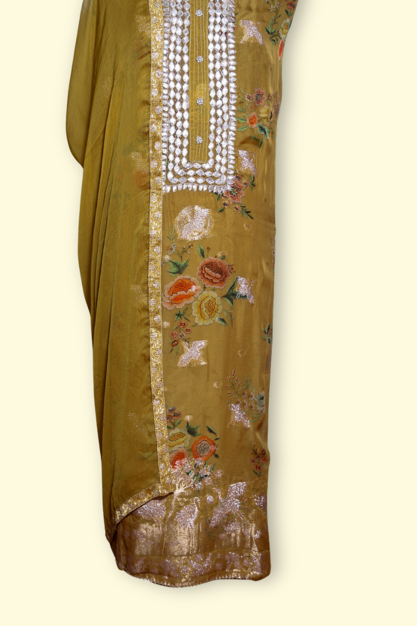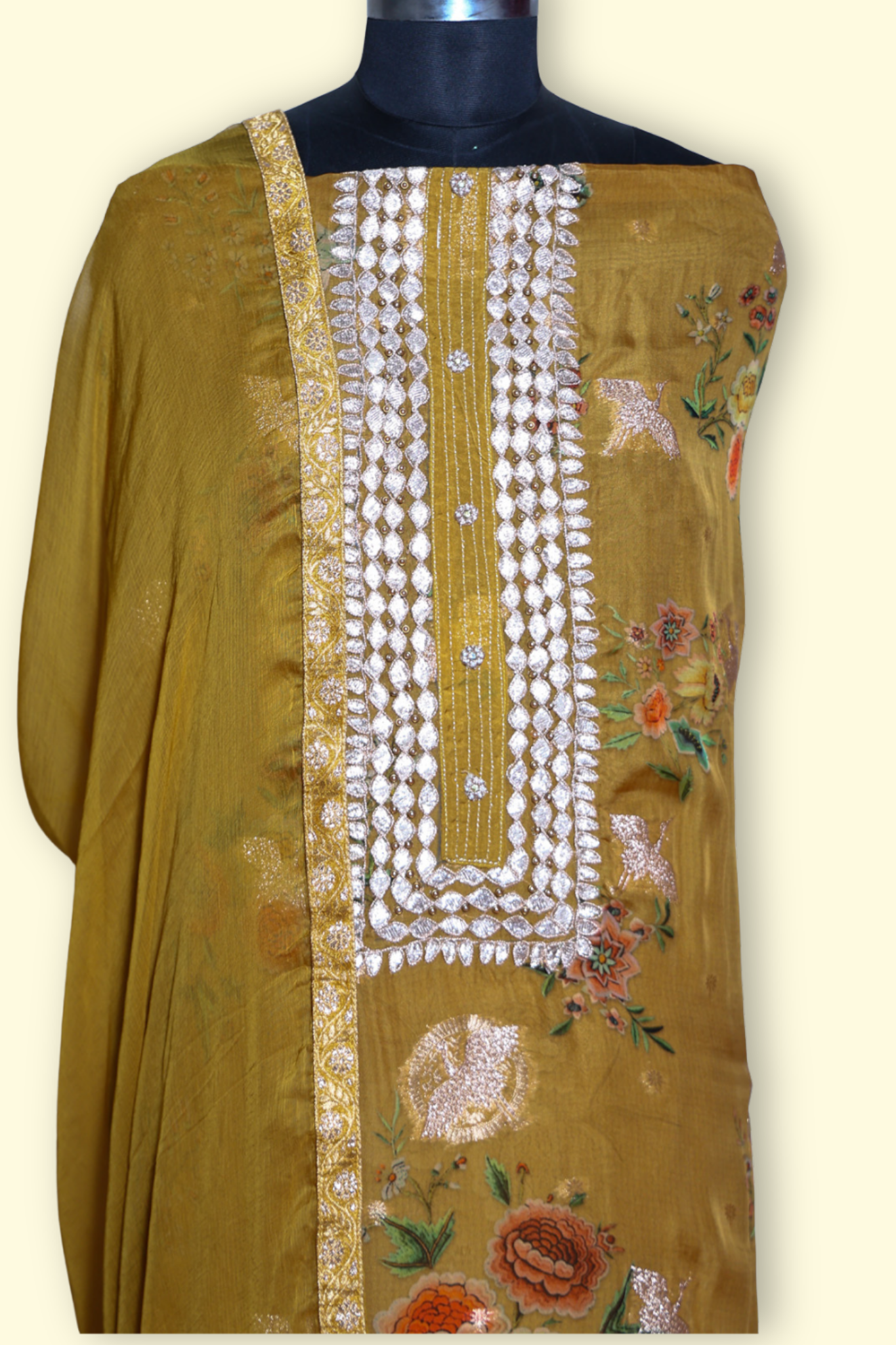 Mustard organza unstitched kurta with beautiful Gota patti embroidery on neck line. The combination of mustard organza and Gota patti work creates a stunning glamorous look perfect for party and grand occasions.