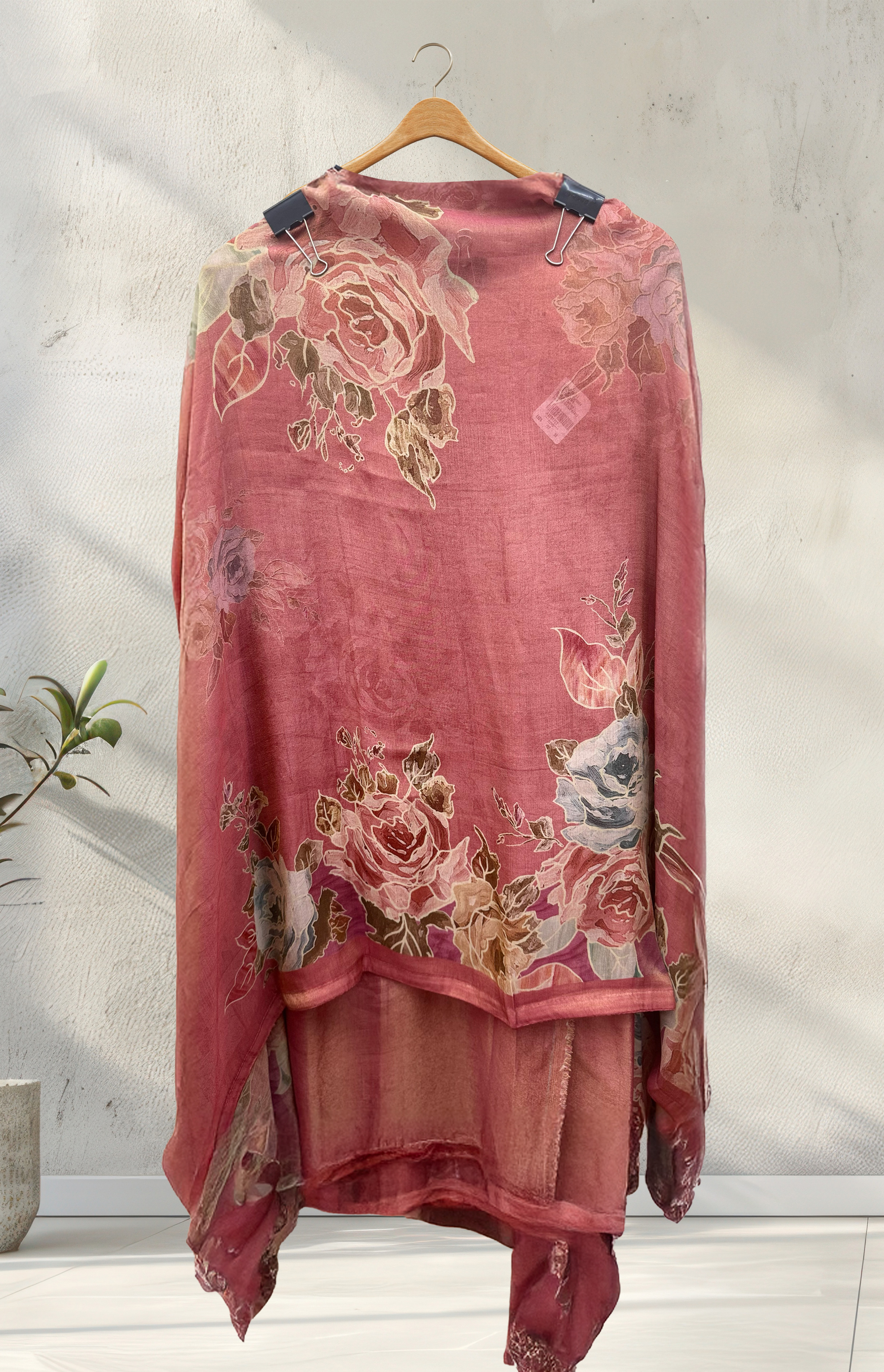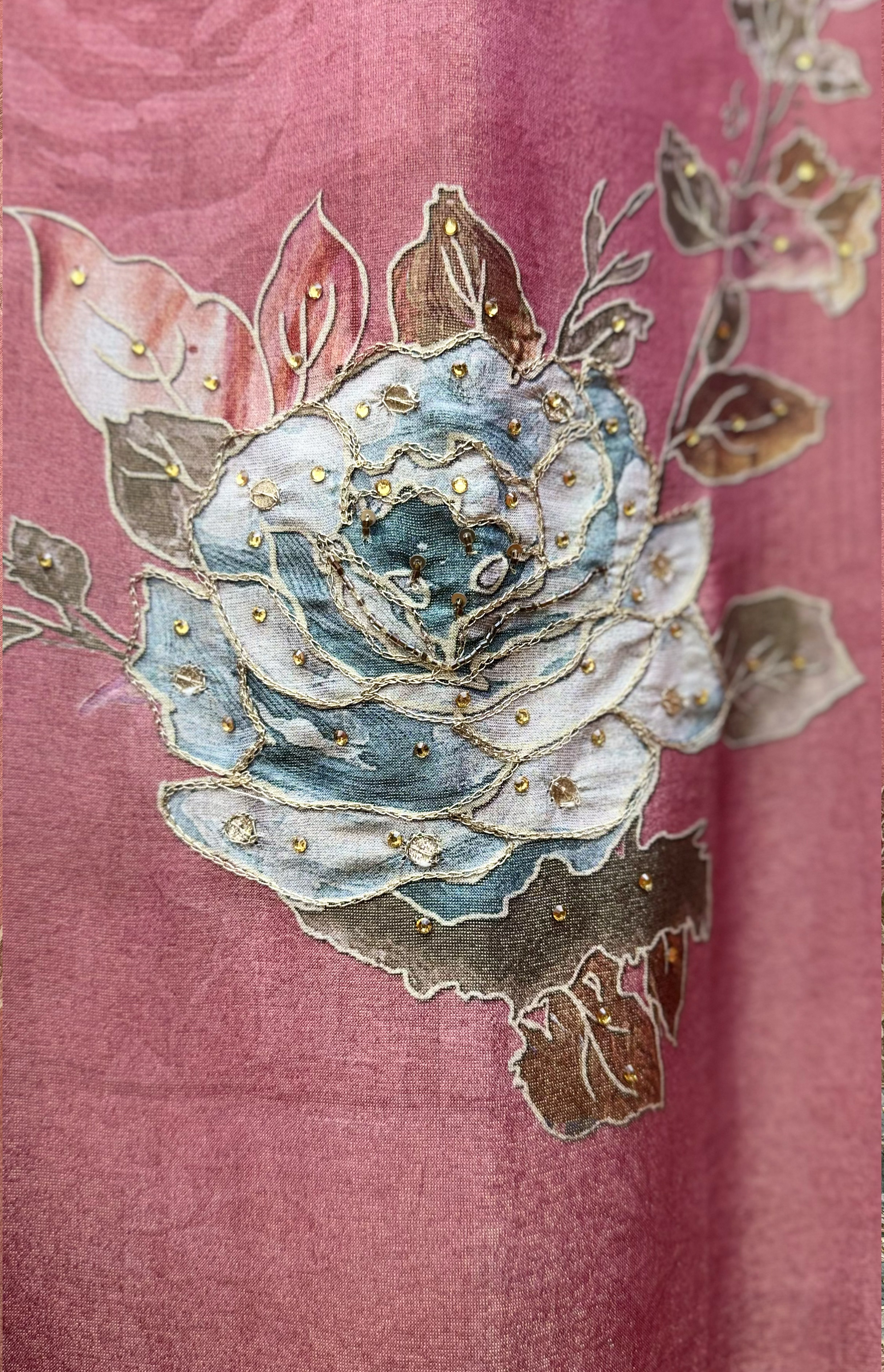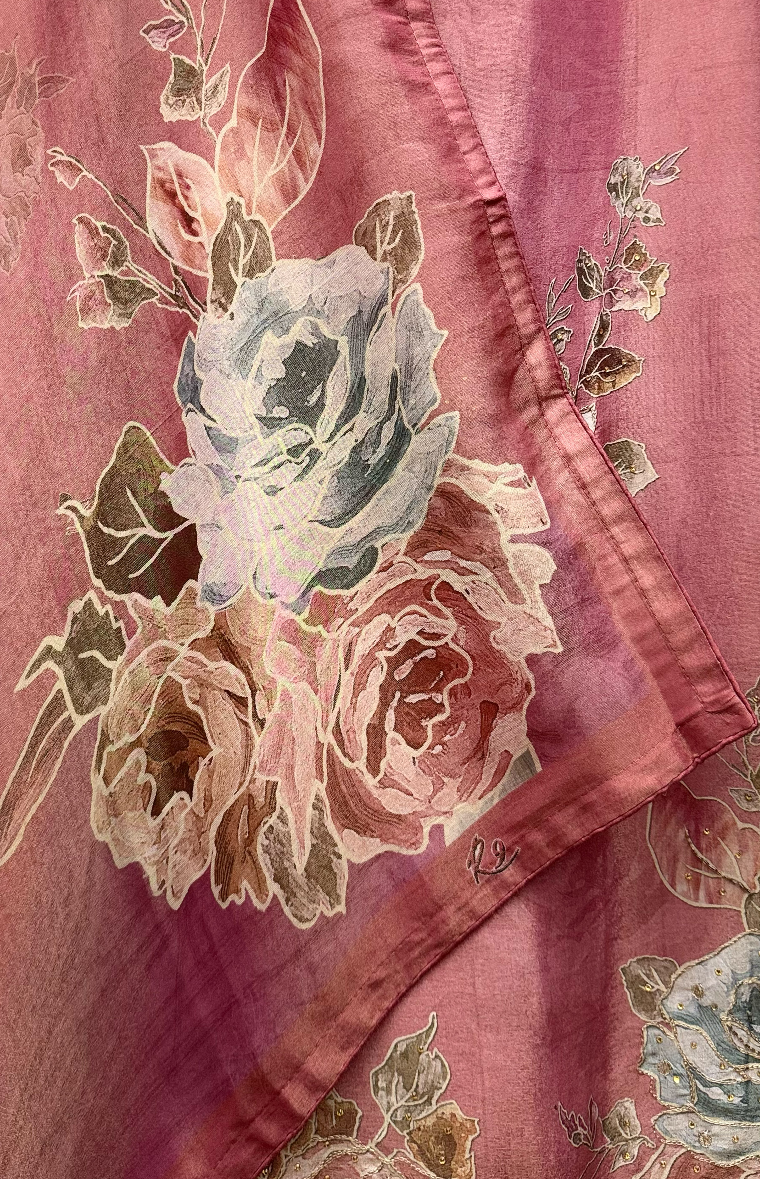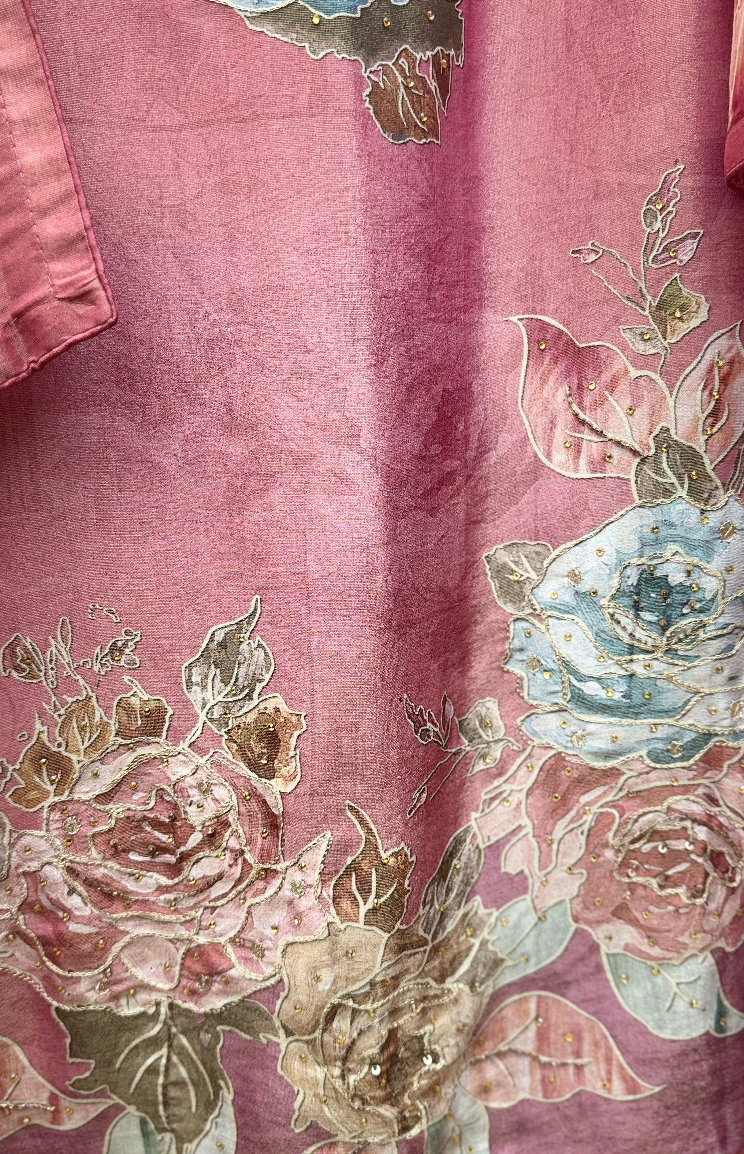 Pink modal shimmer zari highlighting on printed flowers. The combination of pink modal shimmer and zari highlighting creates a stunning party look perfect for grand occasions.