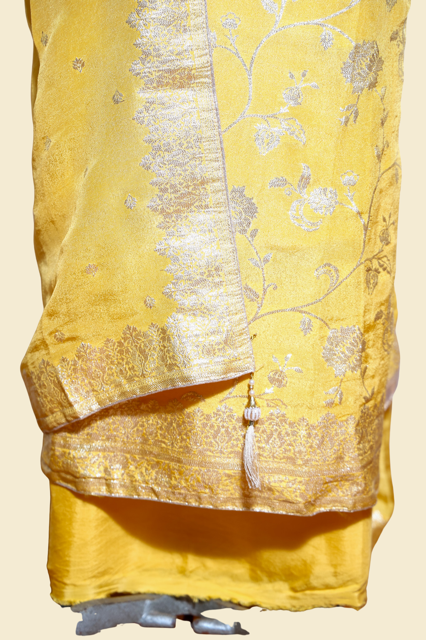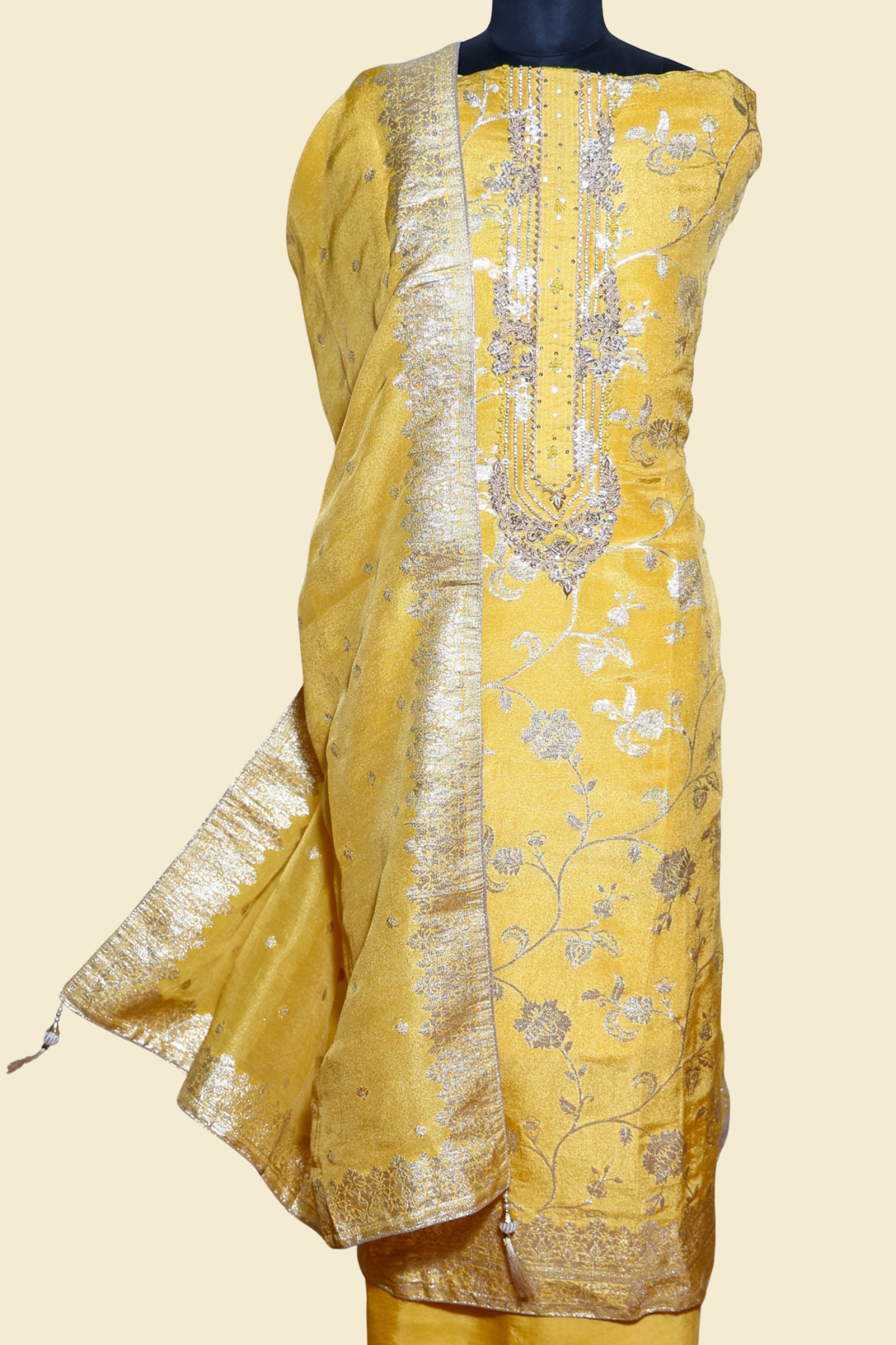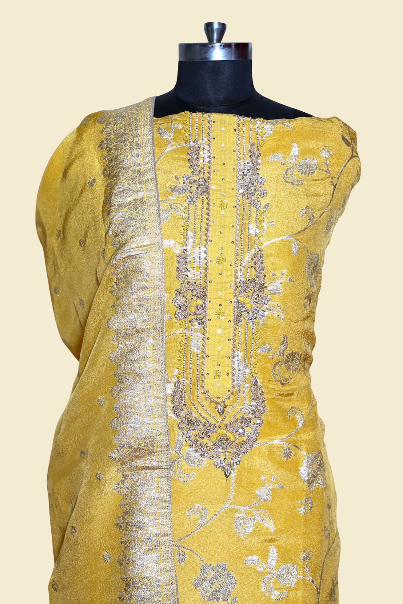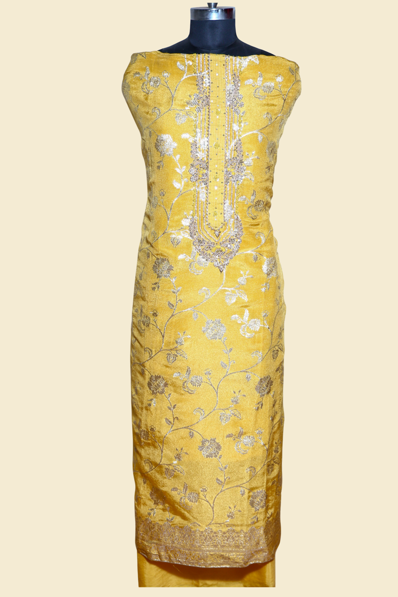 Yellow banarasi silk unstitched kurta with beautiful dabka and pearl embroidery on front. The combination of yellow banarasi silk and dabka work creates a stunning glamorous look perfect for party and grand occasions.